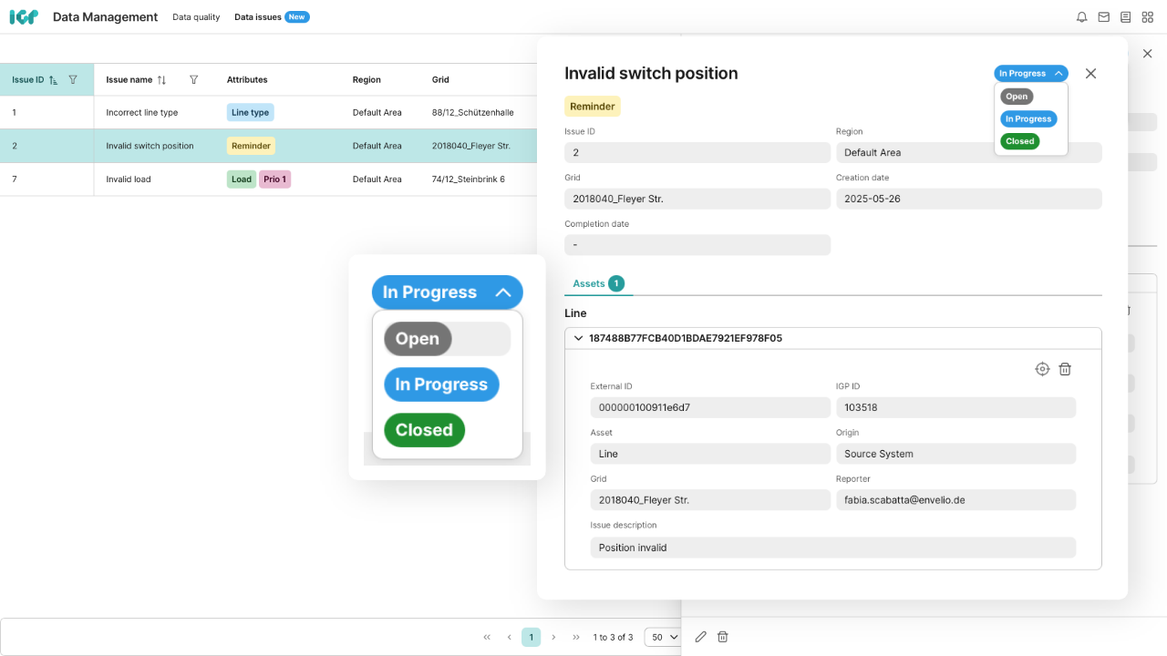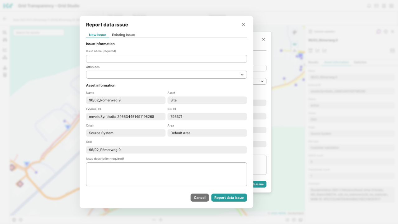 Wrong line type, faulty switch state, incorrect inner wiring? Not a problem! If you come across a data issue, you can report it directly from within the IGP — the respective form appears automatically. All the information entered here is clearly displayed in the respective tab in the Data Manager. This allows the responsible staff to access the data issues and take action to resolve them.