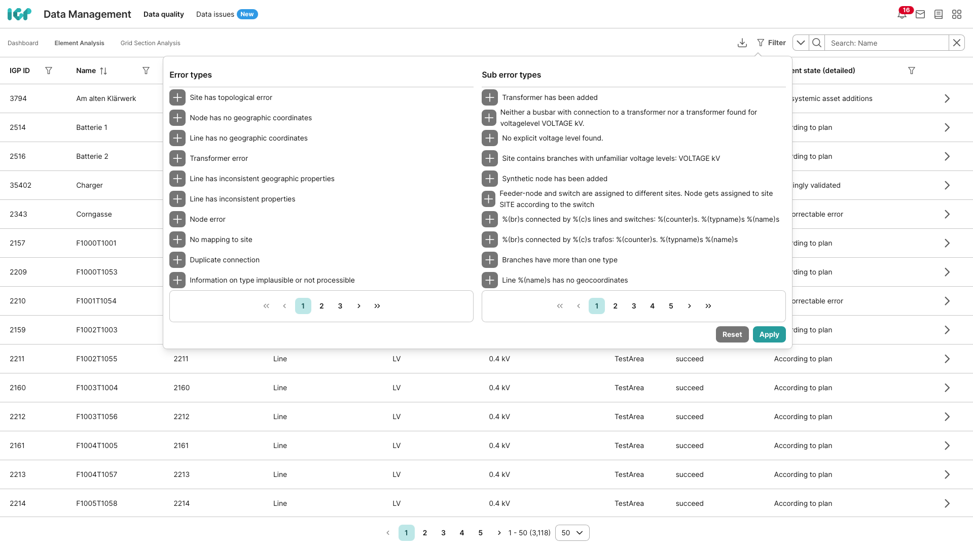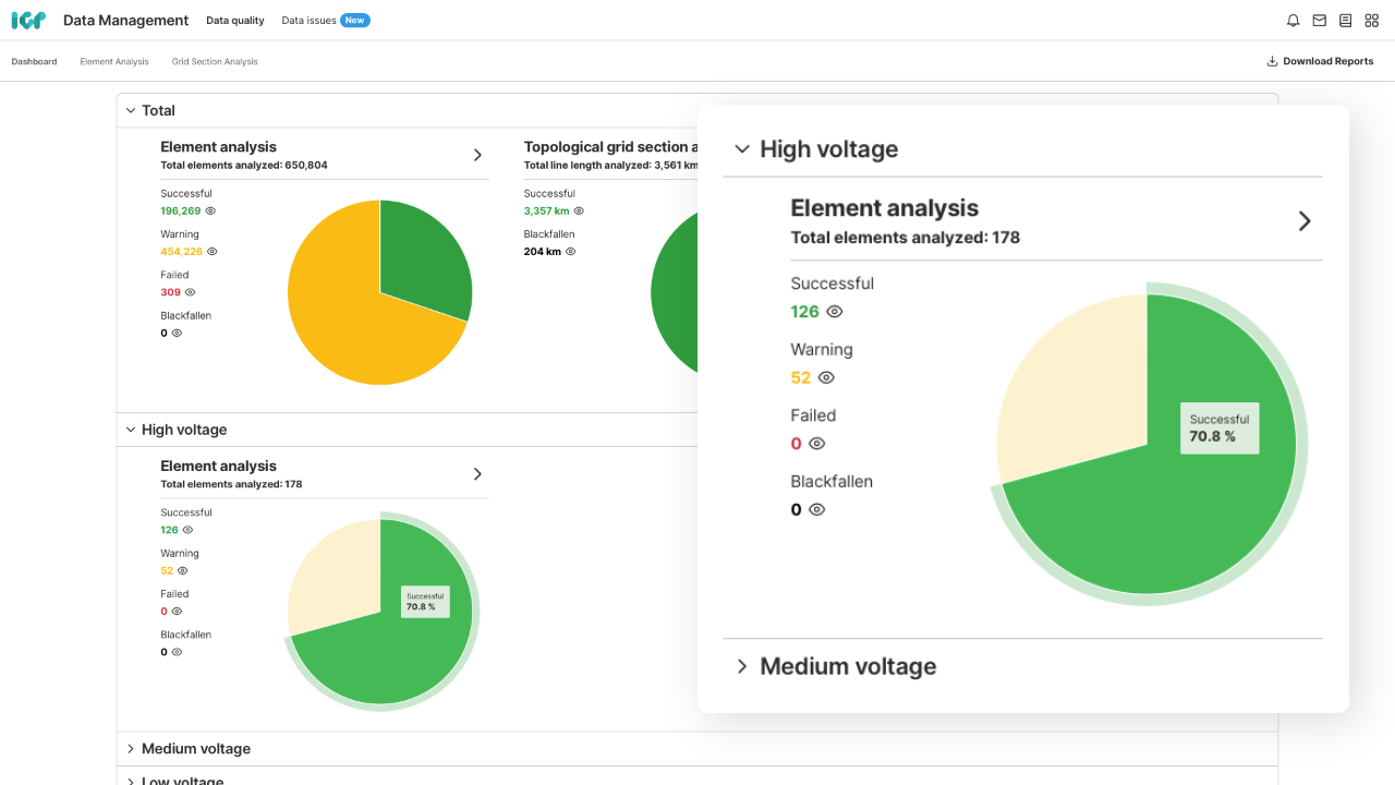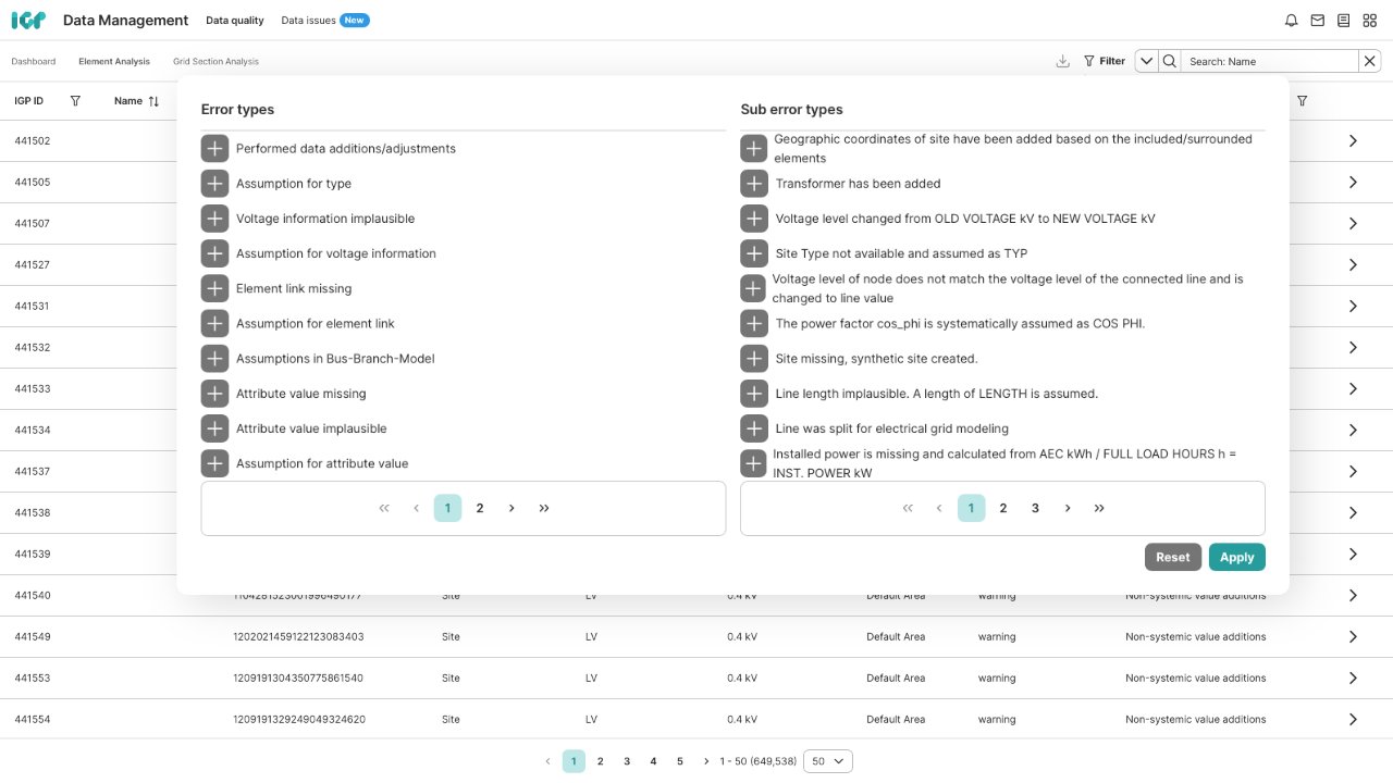 In the detail view of the elemental testing, you can look for specific imported elements and filter by type, voltage level, status, and quality level. Data issues and assumptions are clearly marked as error or sub error types, which can also be filtered by. The data can be conveniently exported as an Excel or a CSV file for further analyses. This helps correct the data in the source systems – providing a better overview for you, and a better data basis for all connected systems.
