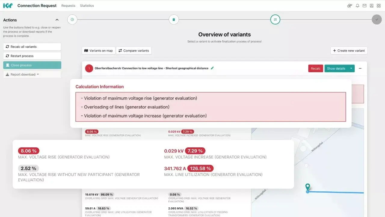 The app automatically searches for and calculates the most suitable point of interconnection within seconds. Possible grid interconnection variants such as shortest geographical distance or shortest electrical distance are automatically identified and directly technically evaluated. Any potential limit violations are immediately marked in the app.