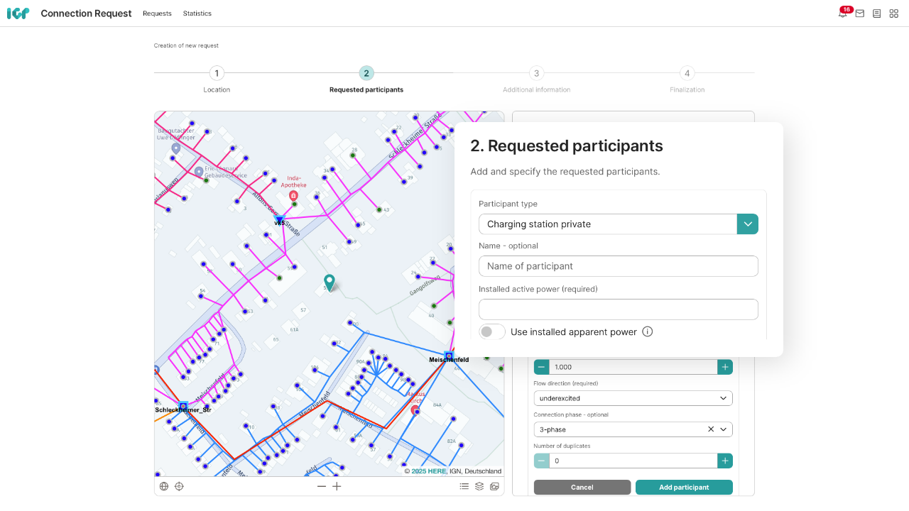 Evaluating new interconnection requests is intuitive and quick. Select the correct flow direction or connection phase via a dropdown menu, optionally enter installed active power or contractual active power – the app offers a lot of flexibility for as accurate and fast a grid compatibility check as possible. Moreover, you can expand existing interconnections with newly requested network participants.