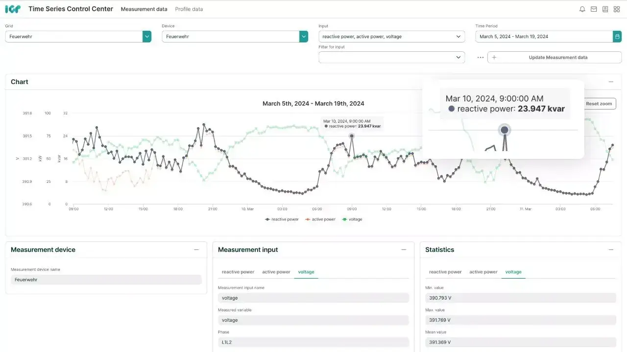 The Time Series Control Center allows flexible metering data analysis as well as substation data analysis and visualization over time – whether in real-time or across hours, days, weeks, or even years. You can validate that measurement devices are integrated correctly and that data import is functioning as expected. The analysis of long-term voltage trends or load fluctuations from the metering and sensor data can offer critical insights into when power grid expansion might be necessary.